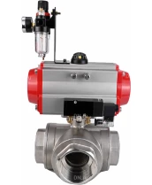 Кран шаровой DN.ru BV3232P(4pc)-SP-3WL-T-ISO-H Ду10 Ру63 стандартнопроходной трехходовой L-тип, нержавеющая сталь SS316, внутренняя резьба, уплотнение - PTFE, с пн.приводом DN.ru PA-DA-052 c пн.распределителем DN.ru 4М310-08 220В NAMUR и БПВ AFC2000