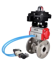 Кран шаровой DN.ru BV3232P(2pc)-FP-F-ISO-H Ду15 Ру40, полнопроходной фланцевый, нержавеющая сталь SS316, уплотнение - PTFE, с пневмоприводом PA-DA-052 двойного действия, с пневмораспределителем 4V320-08 220В, с БКВ APL-410N EX